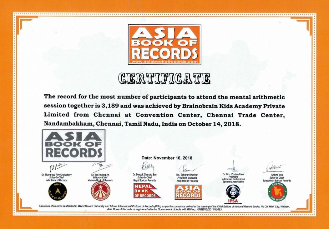 Brainobrain entered the Asia Book of Records for the most number of participants to attend the mental arithmetic session together. 3189 kids attended the session which was held at Chennai...