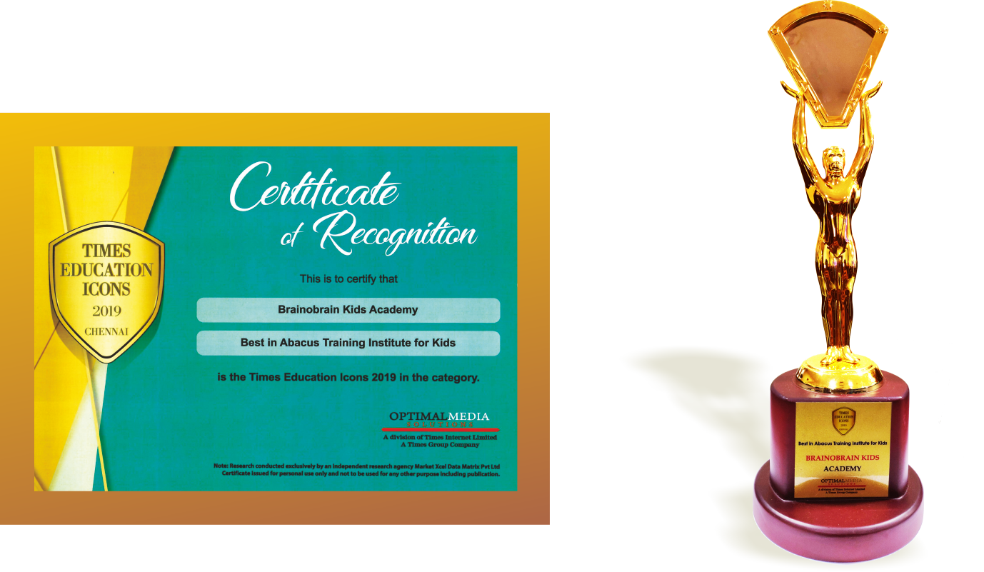 Brainobrain Kids Academy Pvt Ltd has been chosen for the Times Education Icon Award 2019, in the category of the Best Abacus Training Institute for Kids. In March 2019, Grand Master Vishwanathan Anand (5 times World Chess Champion) presented the award to the Directors of Brainobrain, at an event held at Chennai, India..
